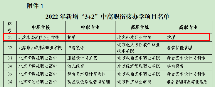 2022年1月21日,北京市教育委员会、北京市人力资源和社会保障局联合发布《关于公布2022年新增及调整"3+2"中高职衔接办学项目的通知》京教职成[2022]1号文件。公示我学校护理学院与北京市海淀区卫生学校成功签约中高职衔接办学项目。