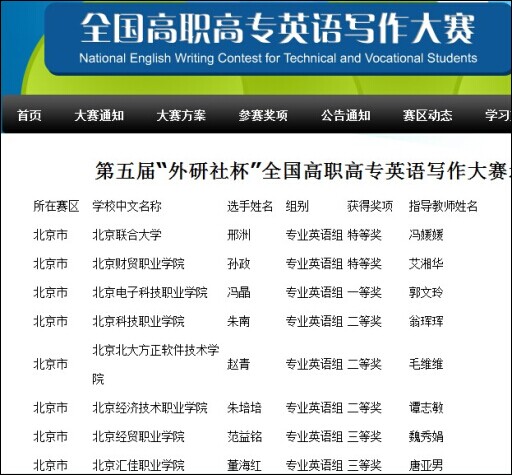 在2014年5月11日举行的全国高职高专英语写作大赛北京赛区的比赛中,我校2012级商务英语专业朱南同学战胜众多参赛选手,获得北京赛区二等奖。这是继2011级商务英语专业吴世喜同学2013年获