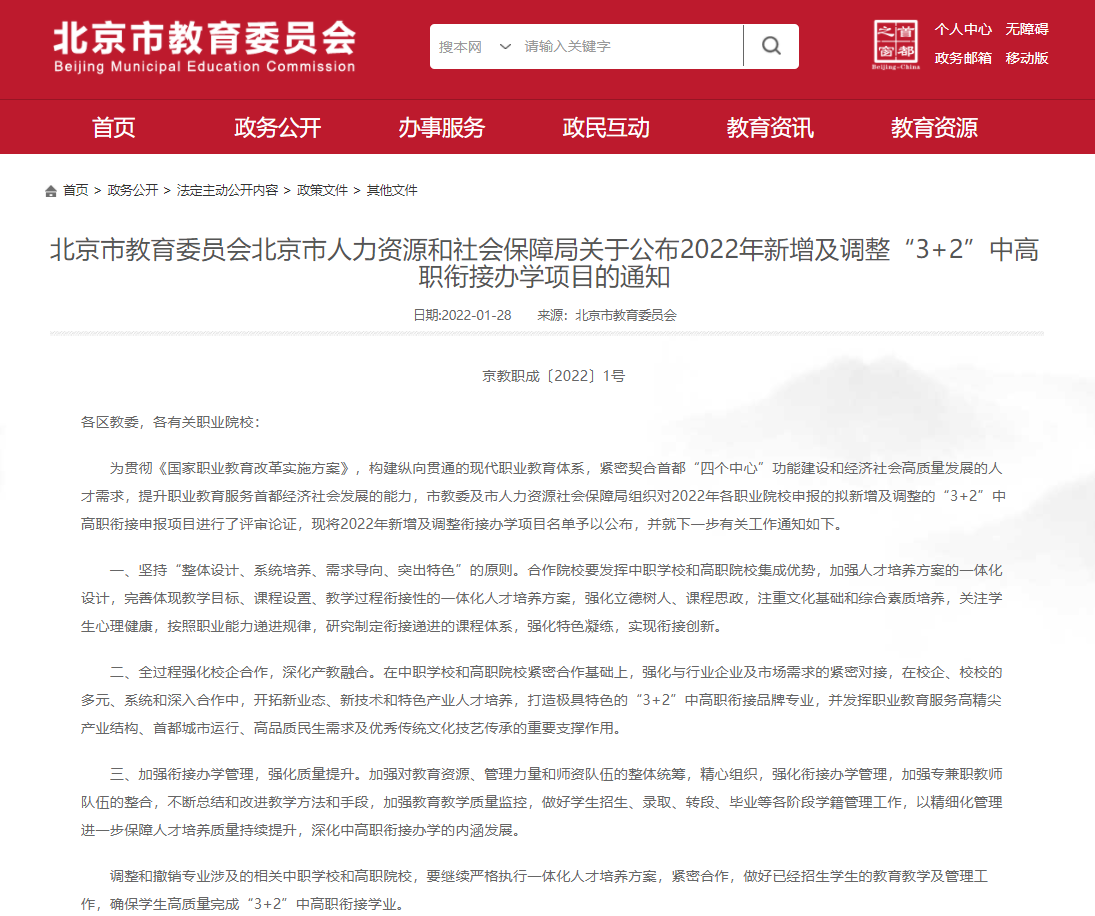 院护理学院与北京市海淀区卫生学校成功签约中高职衔接 2022年1月21日,北京市教育委员会、北京市人力资源和社会保障局联合发布《关于公布2022年新增及调整"3+2"中高职衔接办学项目的通